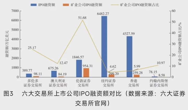 本文聚焦于全球六大证券交易所的公司数量、市值与IPO融资额三个维度进行特征对比。从公司数量来看,多伦多证券交易所的上市公司总数及矿业公司数量均居首位,而香港交易所上市矿业公司数量占比最低。从市值来看,纽约证券交易所的总市值最高,尽管其矿业板块占比不高,但市值依然领先;多伦多证券交易所的矿业公司市值占比最高。从首次公开募股融资额来看,纽约证券交易所的总IPO融资额位居前列,但矿业板块的占比并不高;伦敦证券交易所的矿业公司IPO融资额最高,且占总融资额的一半以上;约翰内斯堡证券交易所在公司数量、市值和IPO融资额这3个维度上的排名均处于末位。