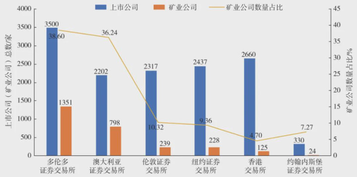 从上市矿业公司在所有上市公司中的占比来看,多伦多证券交易所以38.60%的比例高居榜首,澳大利亚证券交易所则以36.24%的比例紧随其后,相比之下,香港交易所的占比仅为4.70%,排名最末。