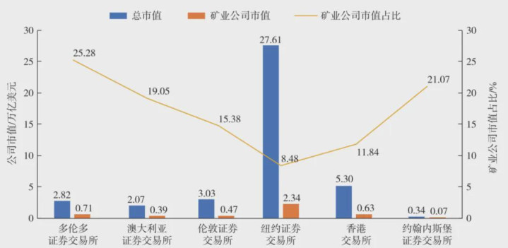 从公司市值看,纽约证券交易所矿业板块占比虽低,但总市值领先