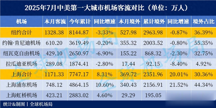 2025年7月中美第一大城市机场客流对比出炉!从前7个月的累计客流表现来看,纽约三大机场完成旅客吞吐量达8144.87万人次,同比增长-3.33;上海两大机场在今年前7个月完成旅客吞吐量7747.17万人次,同比增长8.31%,两大城市的机场客流截止到7月底是相差397.7万人次。从增速情况来看,纽约的三大机场继续保持负增长,其中纽瓦克自由国际机场增幅更是跌至-6.9%。